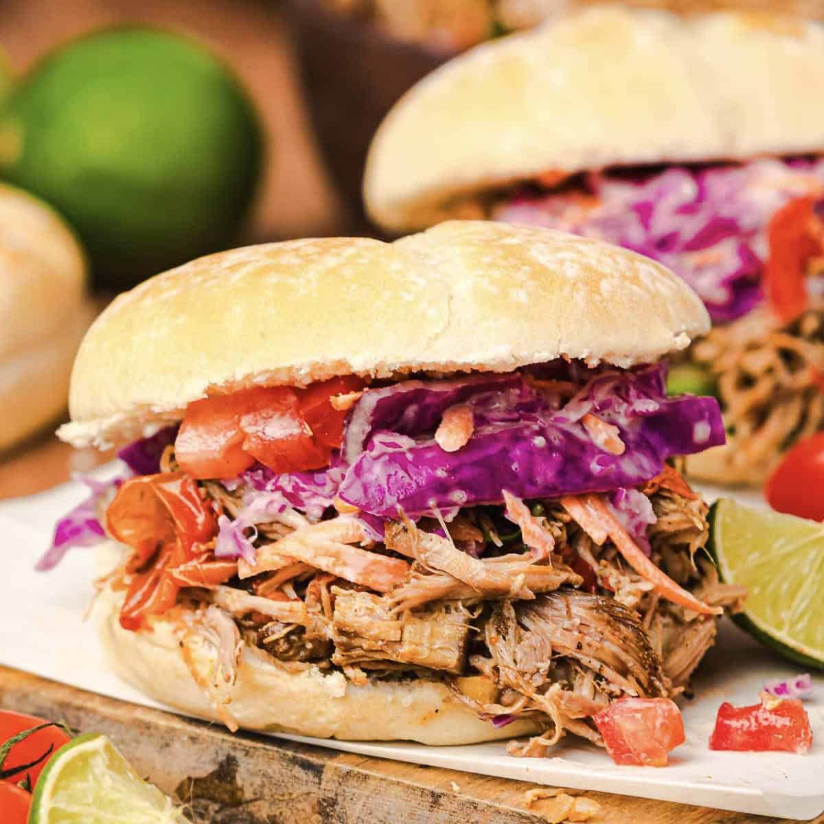 Two slow cooker Tex Mex pulled pork sandwiches with slaw on a board, garnished with lime halves and cherry tomatoes.
